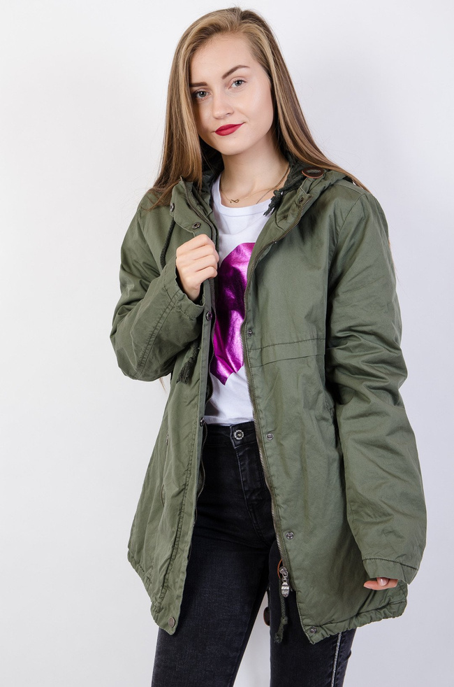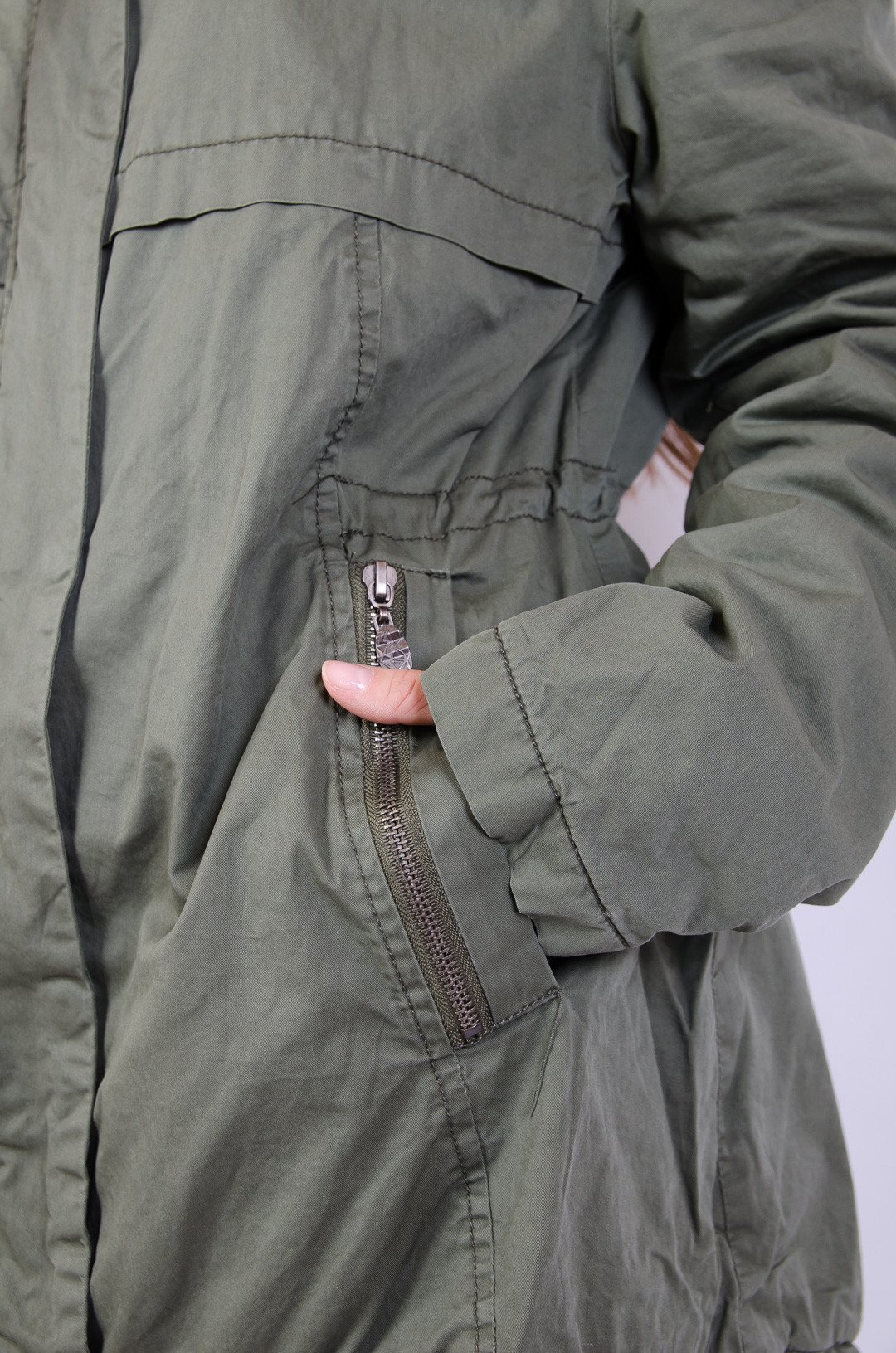 Zielona, asymetryczna kurtka parka wiązana w środku ze ściągaczem na dole.