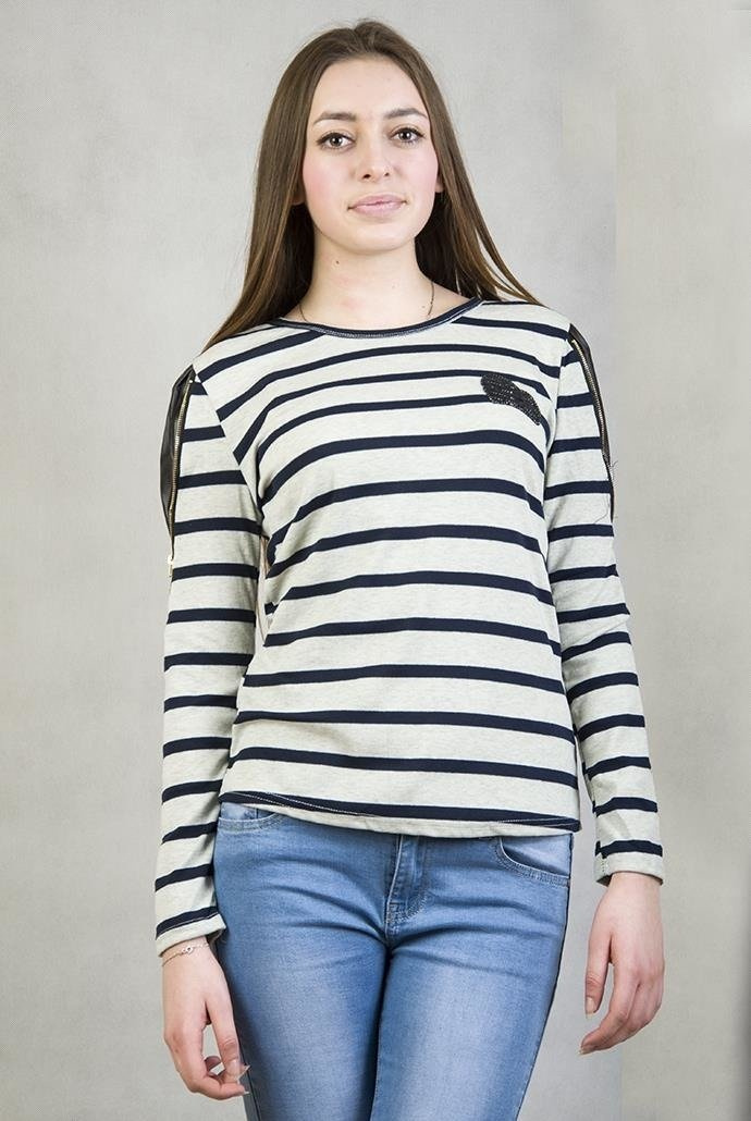 Szaro-granatowa bluzka w paski z czarnym serduszkiem w cekiny, na ramionach skórkowe wstawki zapinane na zamek.