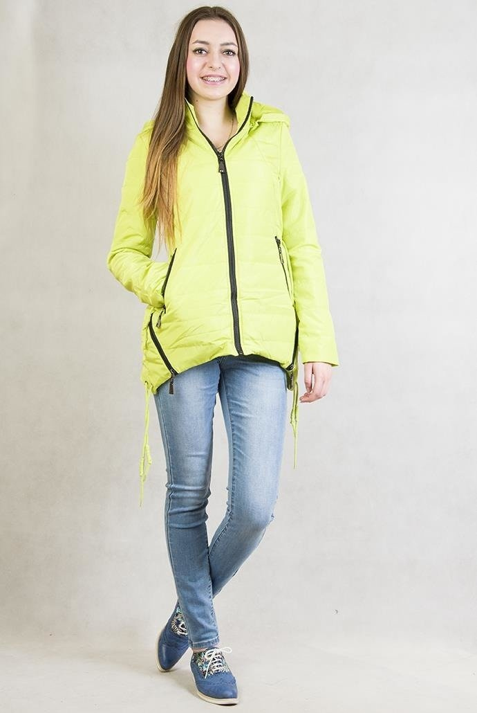 Wiosenna, asymetryczna limonkowa kurtka z kapturem zapinana na zamek.