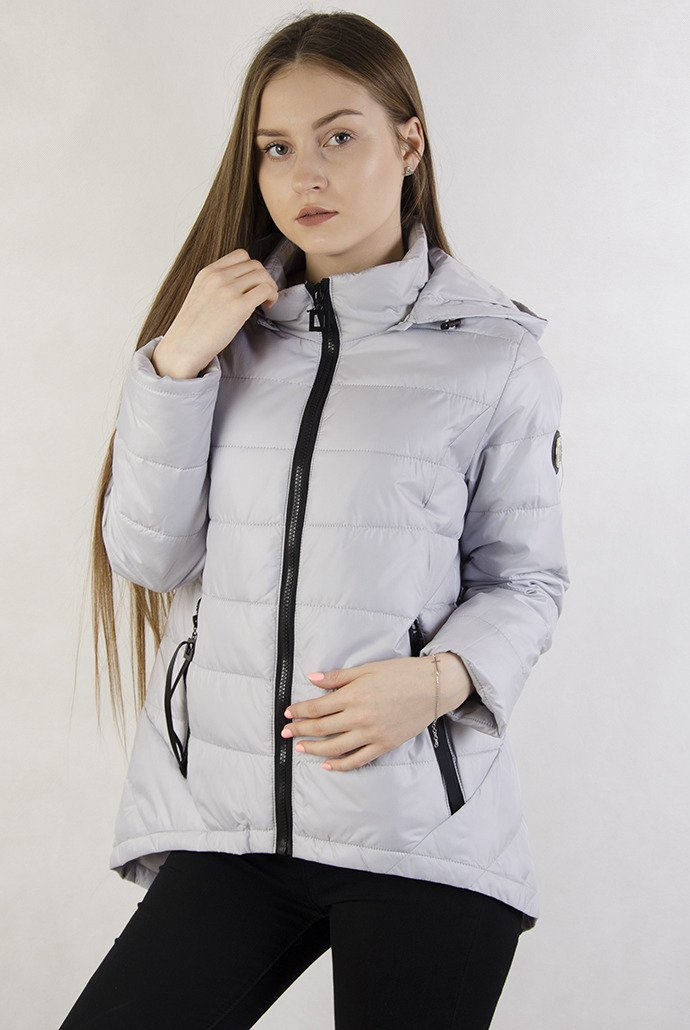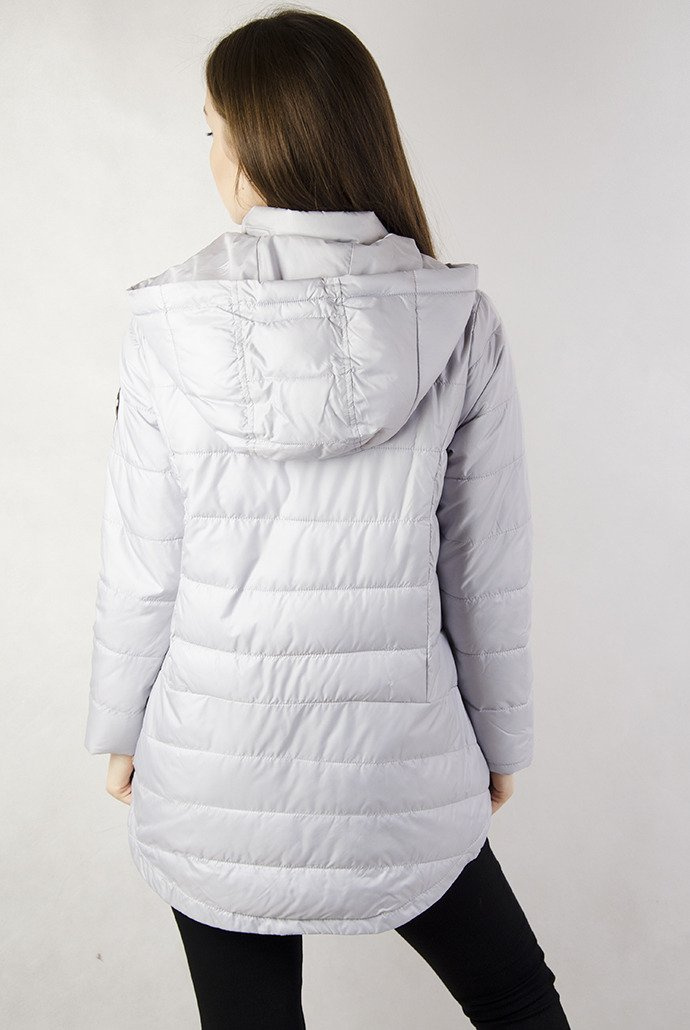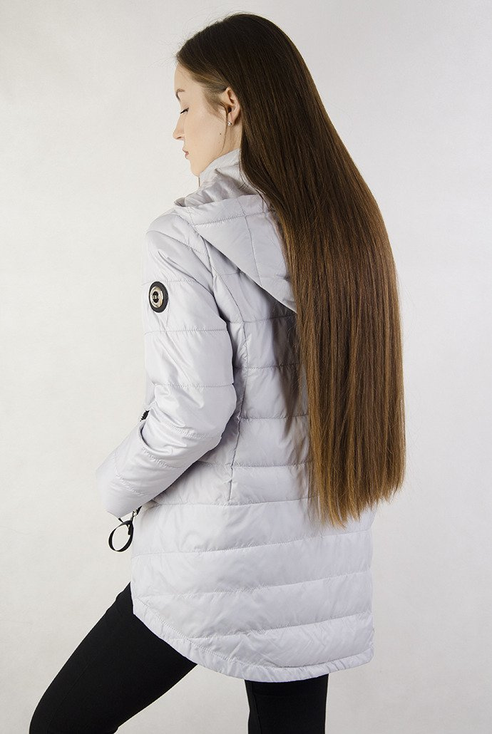 Asymetryczna szara kurtka z kapturem zapinana na zamek.