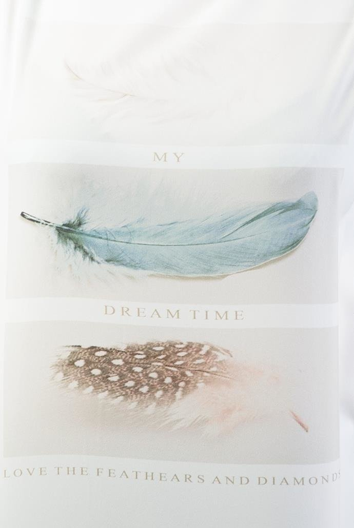 Beżowa bluzka ze sztampą w piórka oraz koronkowymi wstawkami na ramionach.