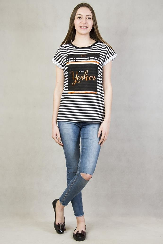 Biała bluzka w czarne paski z napisem : N1 HIGH GLAM NEW YORKER.