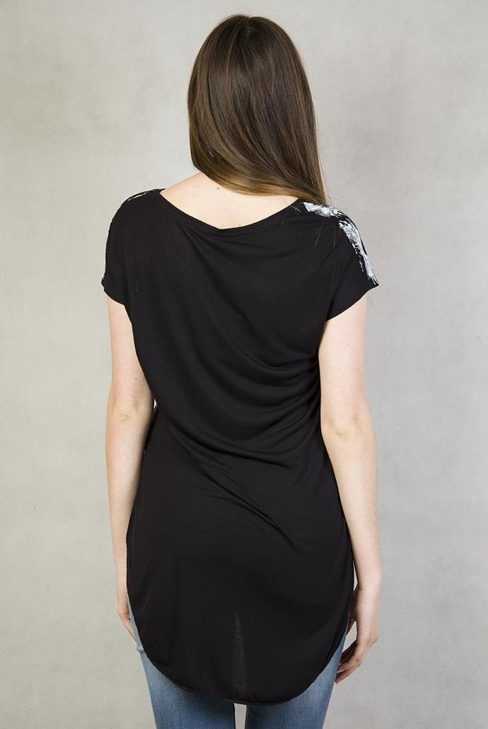 Czarna, asymetryczna bluzka w piórka z napisem "Dreamer deserve your dream"