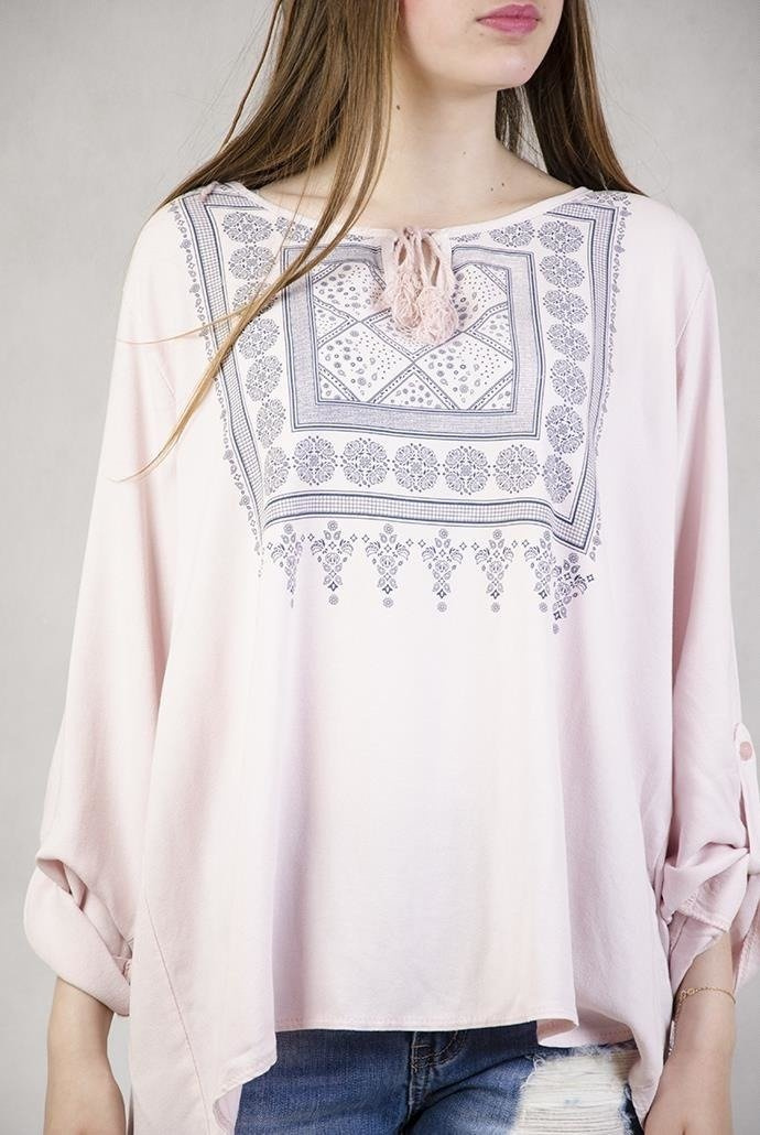 Różowa bluzka we wzorki z rękawem zapinanym na guzik oraz wiązana sznurkiem przy dekolcie.