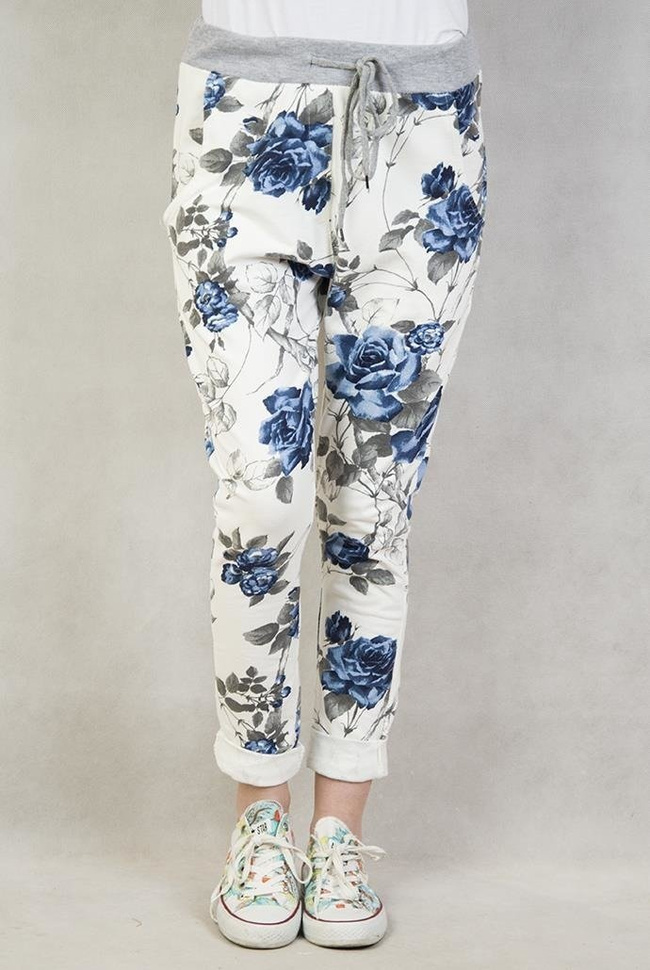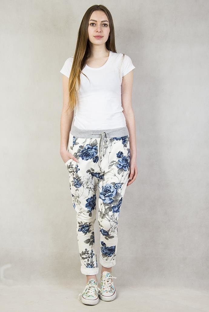 Spodnie dresowe w niebieskie kwiaty wiązane na sznurek
