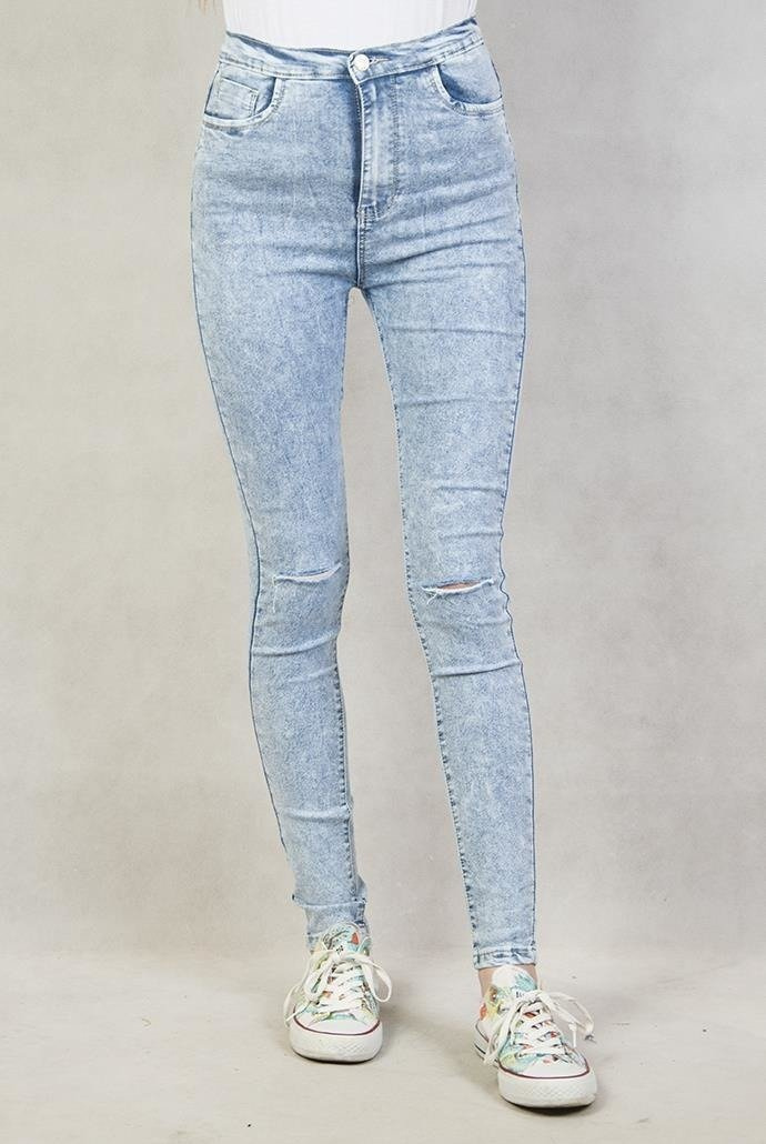 Spodnie dekatyzowane z przecięciami w kolanach.
