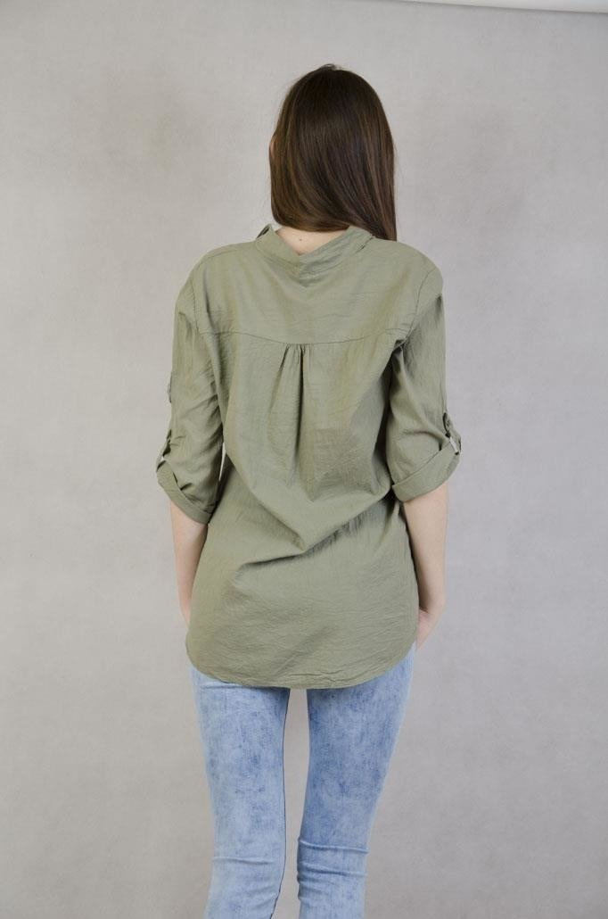 koszula w kolorze oliwkowym z naszywkami w stylu militarnym