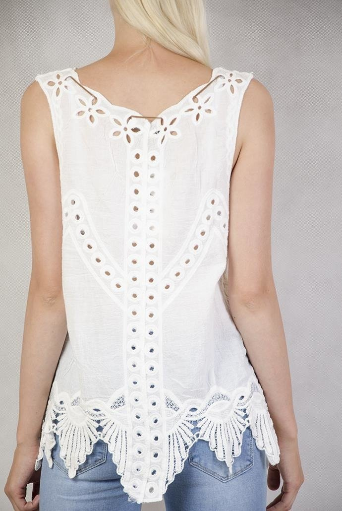 Biała bluzka w ażurowe wzorki z rzemykiem z piórkiem