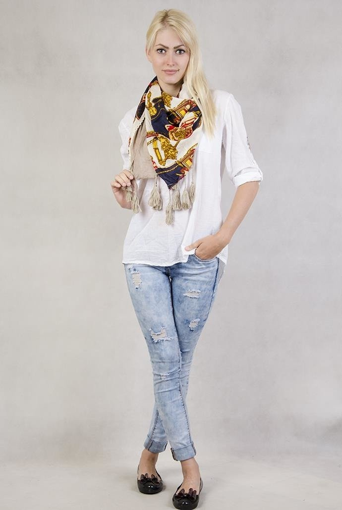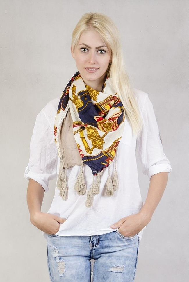 Beżowo-granatowy szal ze złotymi wzorami z frędzlami