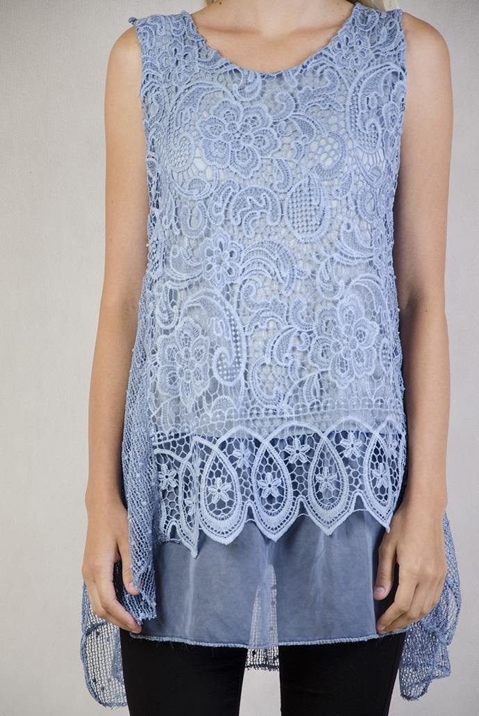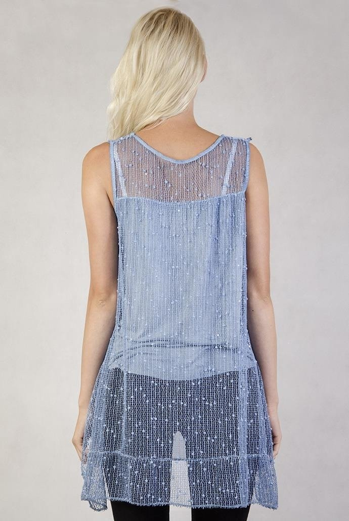 Ażurowa bluzka w kwiaty z cekinami na plecach niebieska