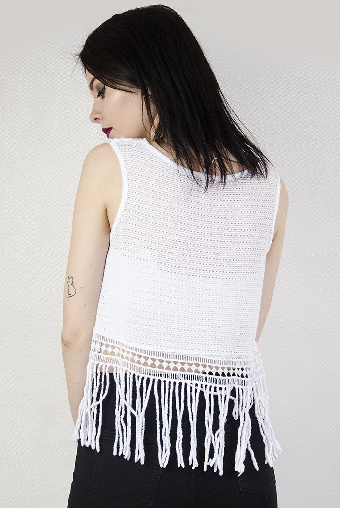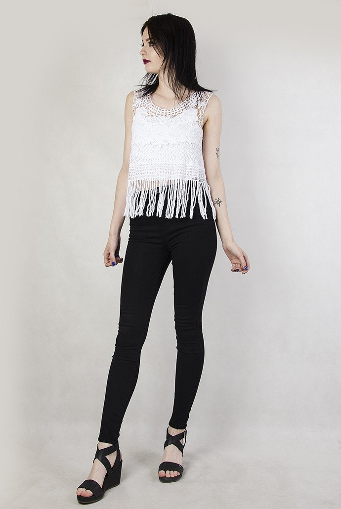 Krótka, koronkowa, biała bluzka z frędzelkami.