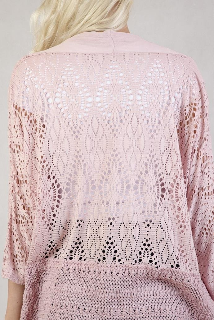 Koronkowa narzutka z szerokim plecionym pasem na dole różowa