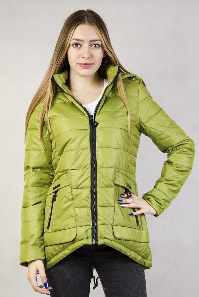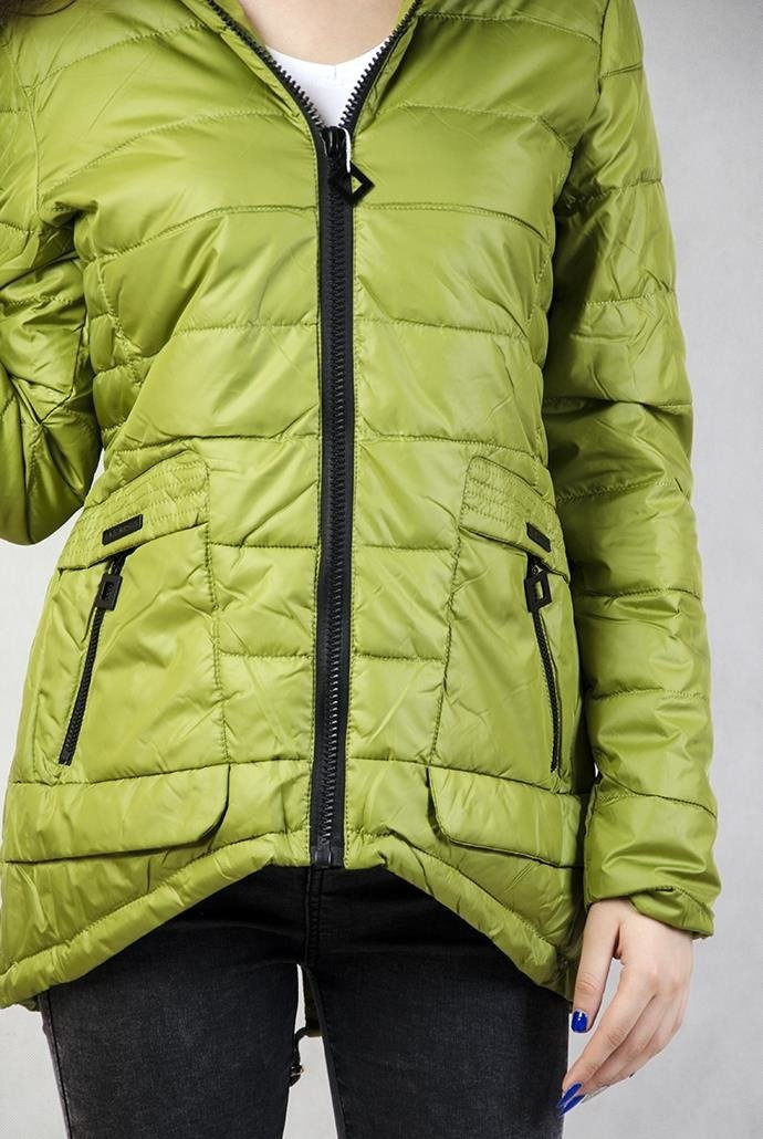 Zielona, pikowana kurtka z asymetrycznym dołem, ściągana z tyłu