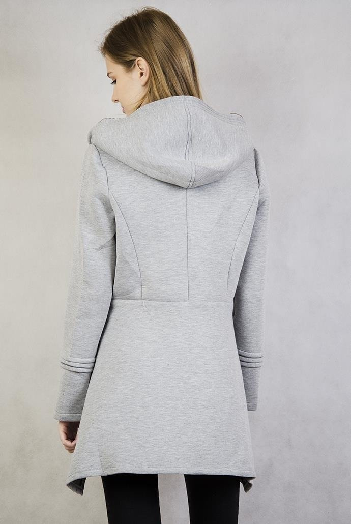 Wygodny, asymetryczny płaszczyk z kapturem.