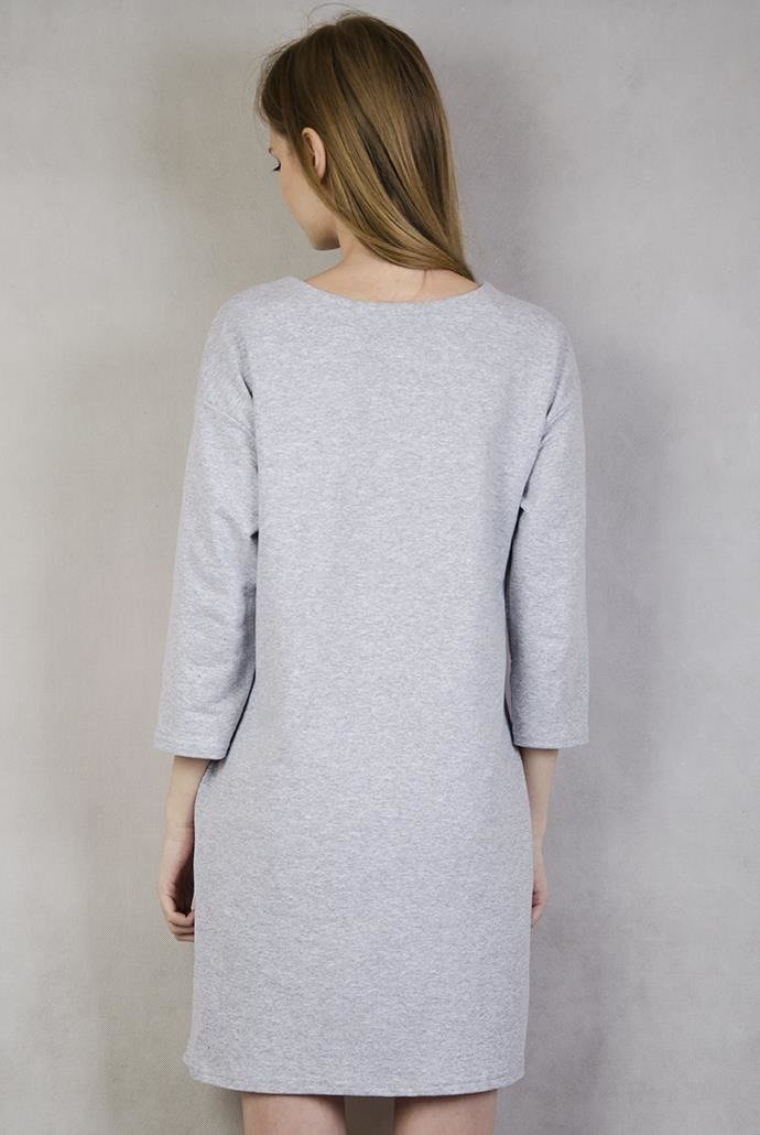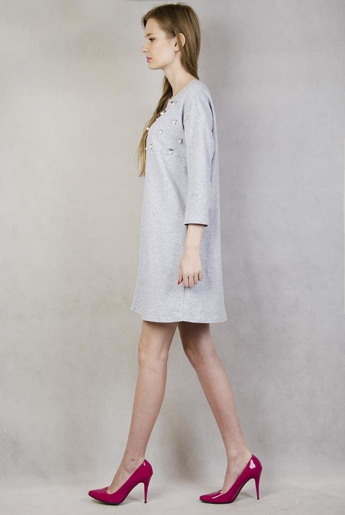 Jasnoszara sukienka z koralikami i rękawem 3/4