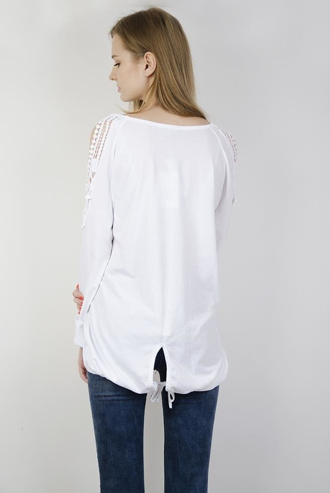 Biała bluzka z wycięciami, ażurowymi wstawkami przy ramionach, z podwijanym rękawem oraz ściągaczem na dole.