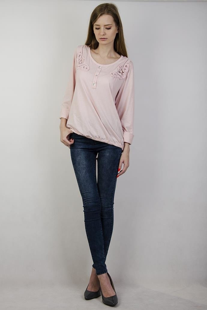 Jasnoróżowa bluzka z guzikami, wzorami przy ramionach i ściągaczem na dole