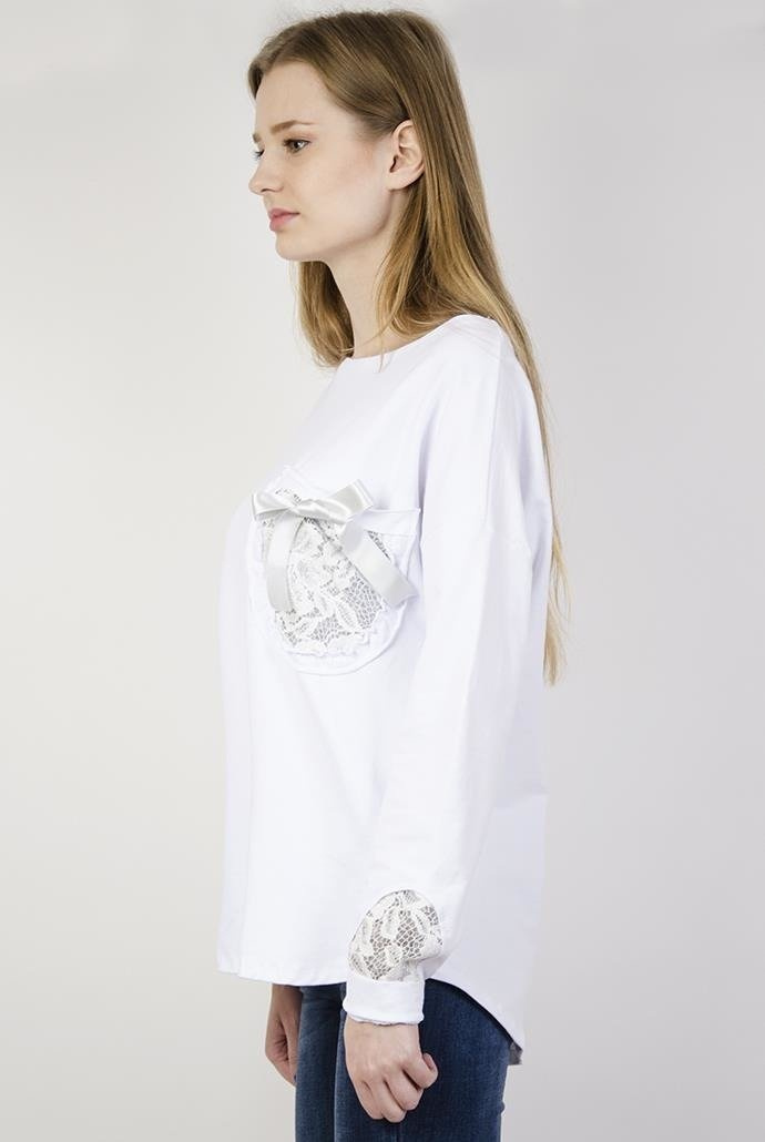 Biała bluzka z kokardką przy kieszonce i zdobieniami przy rękawach
