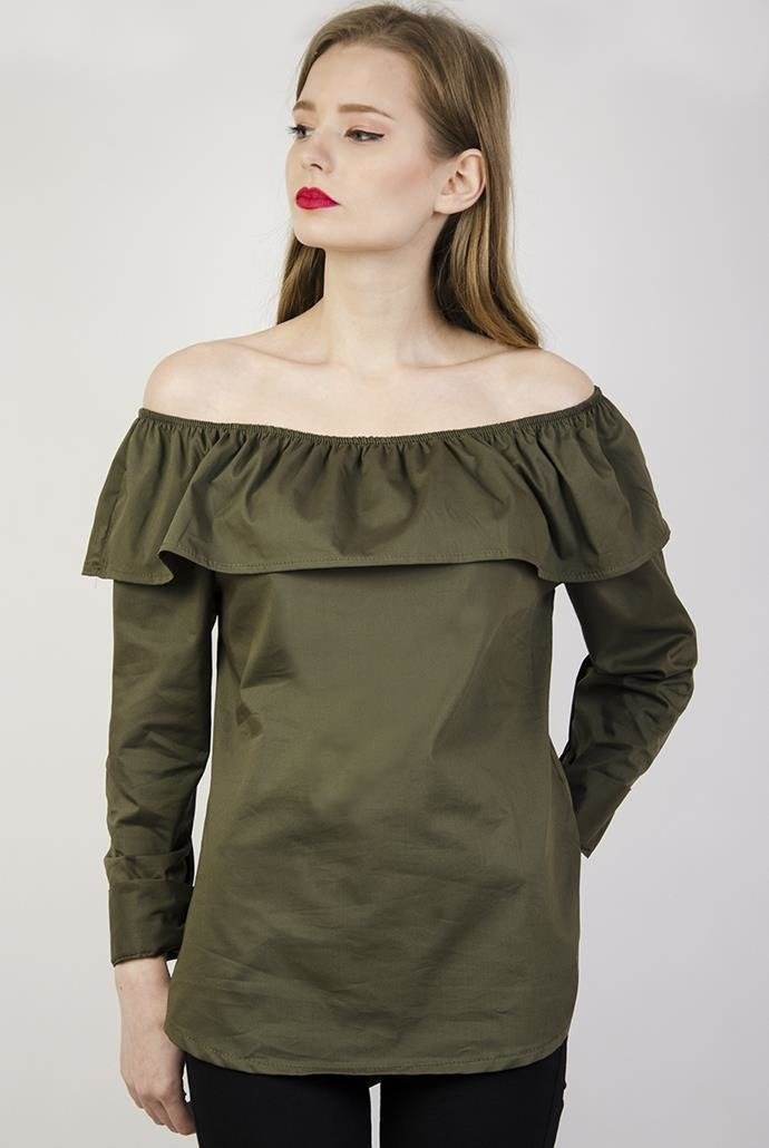 Koszula zielona asymetryczna z hiszpańskim dekoltem, posiada guziki przy rękawach
