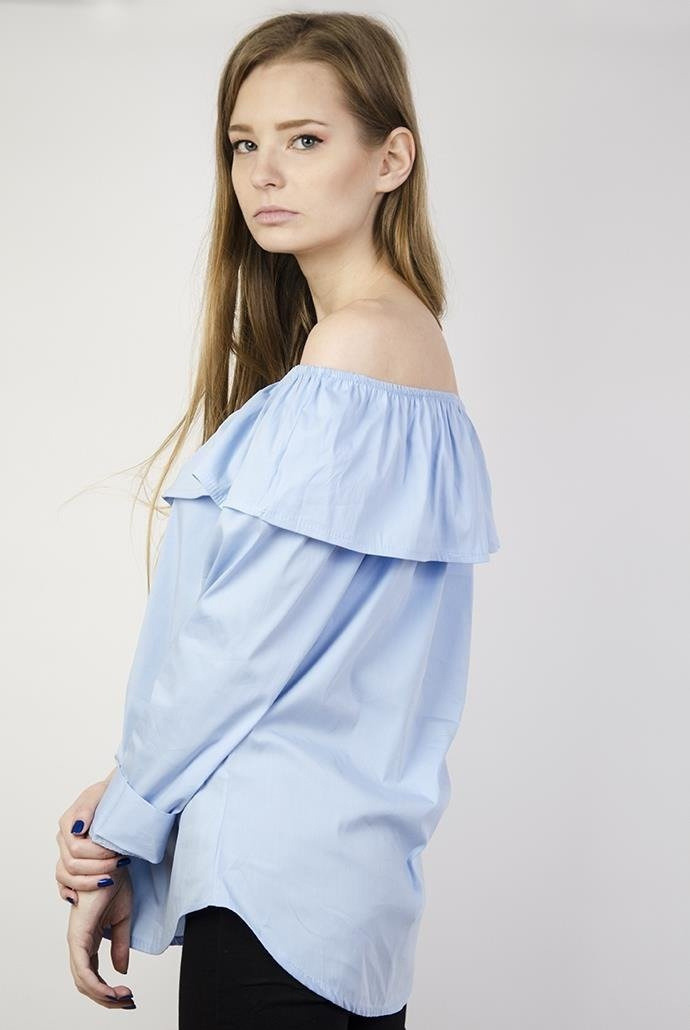 Koszula błękitna asymetryczna z hiszpańskim dekoltem, posiada guziki przy rękawach
