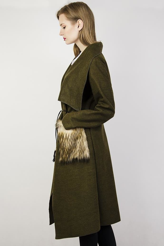 Zielona narzuta z rzemykiem w pasie i futerkiem przy kieszeniach