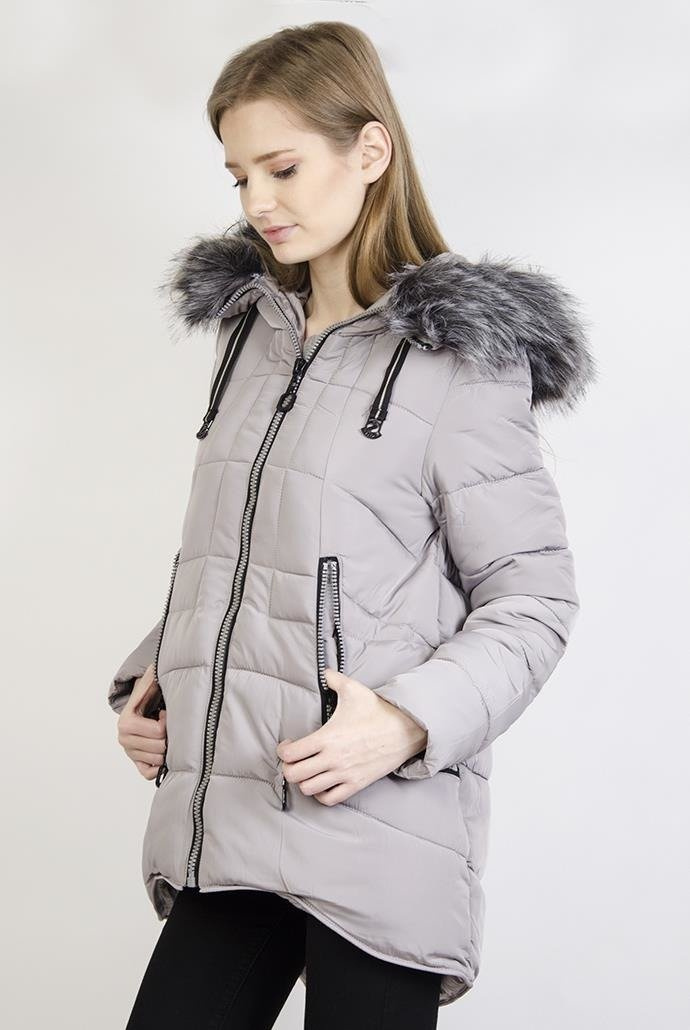 Ocieplana szara asymetryczna kurtka z kapturem.