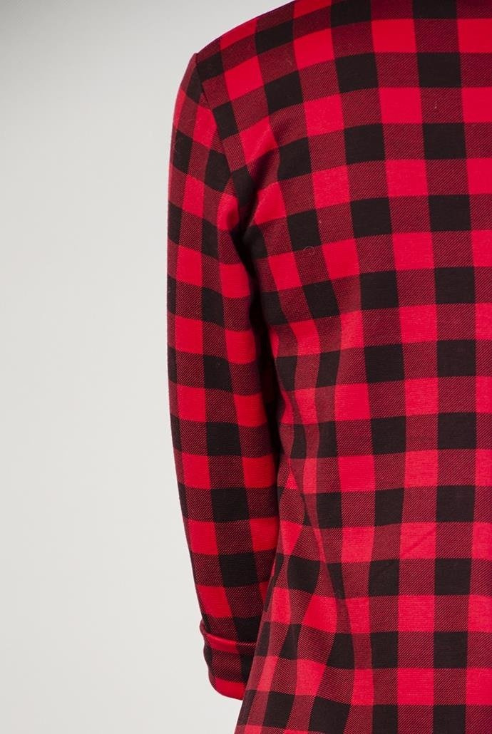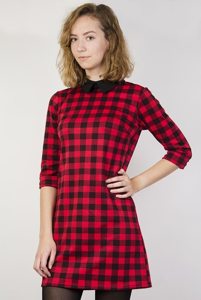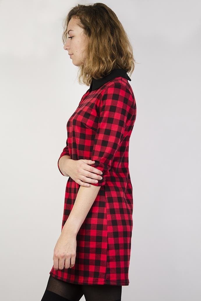 Sukienka w kratę z czarnym kołnierzykiem, zapinana na zamek