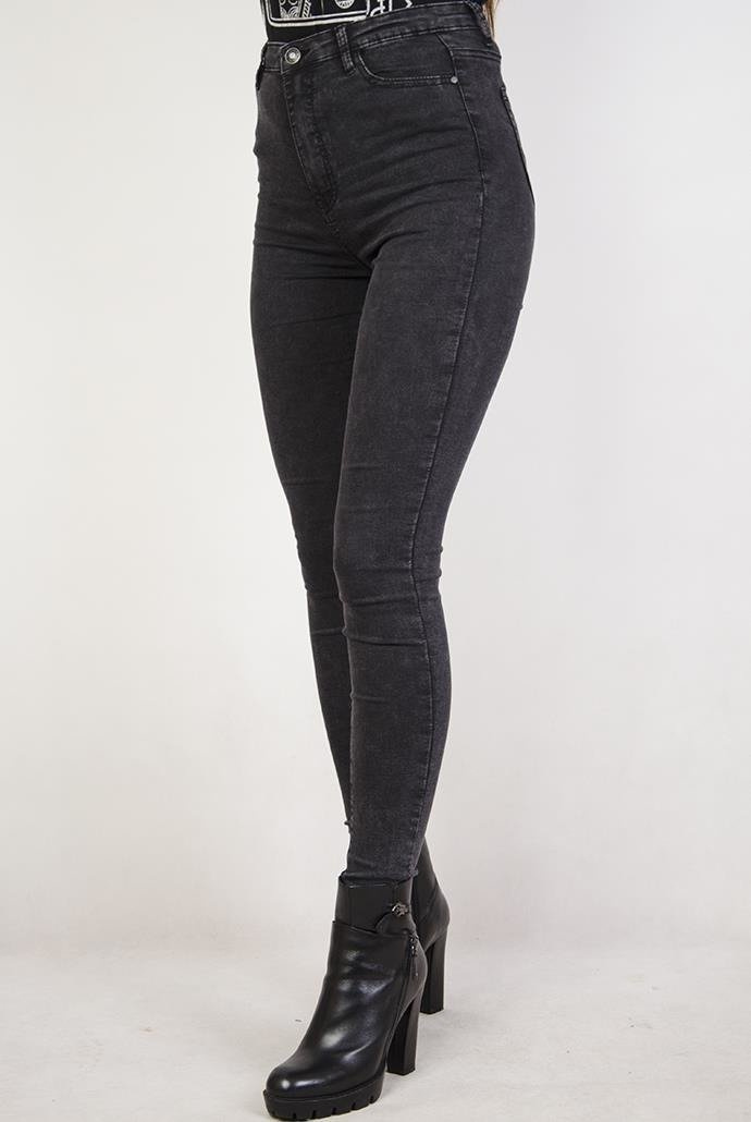 Ciemnoszare, marmurkowe spodnie jeansowe z wysokim stanem
