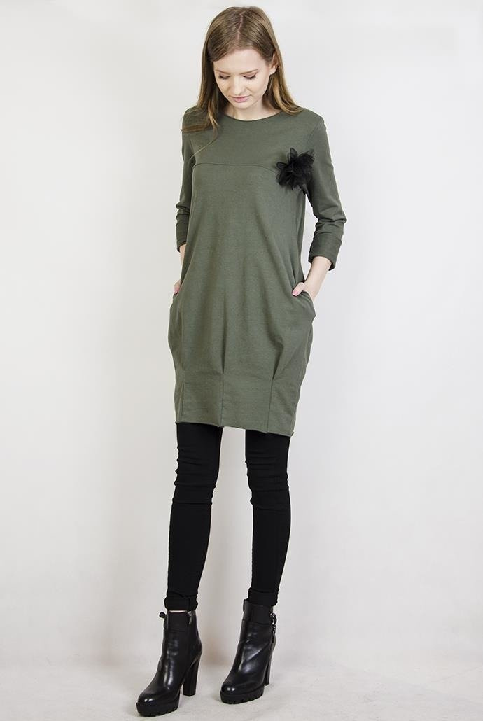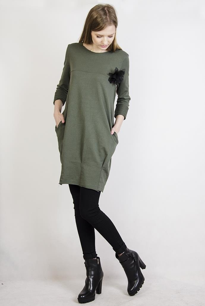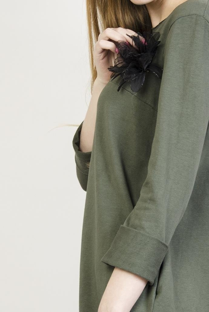 Zielona tunika z czarnym dopinanym kwiatem, posiada kieszenie i rozszerzany dół.