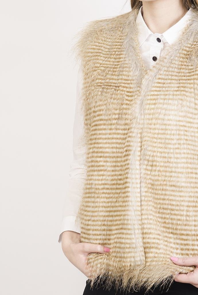 Beżowa, włochata kamizelka z brązowymi paskami. Zapinana na haczyk.