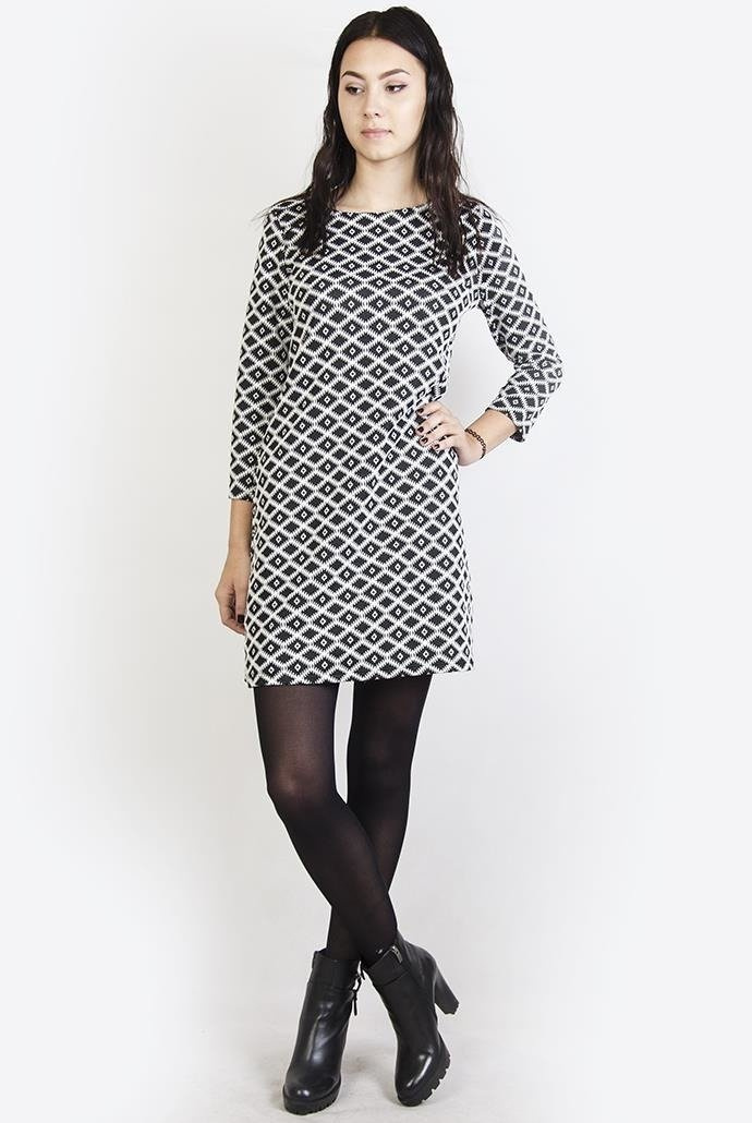 Biało-czarna sukienka w romby z rękawem o długości 7/8.