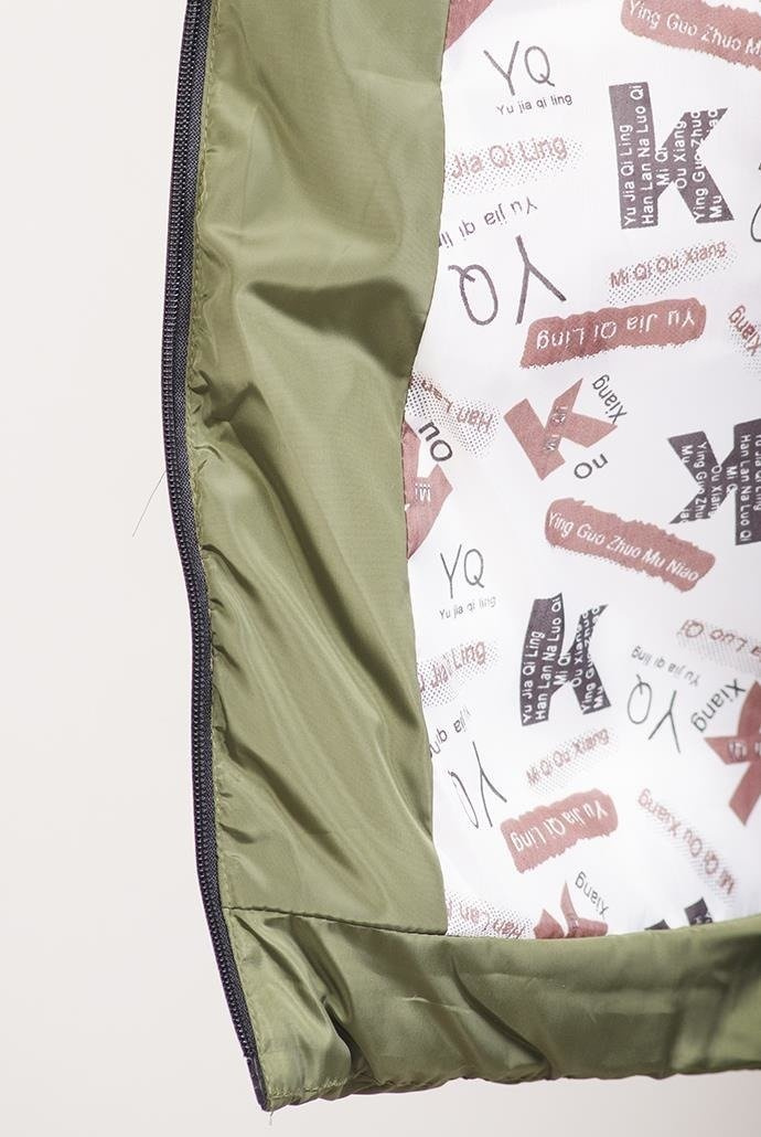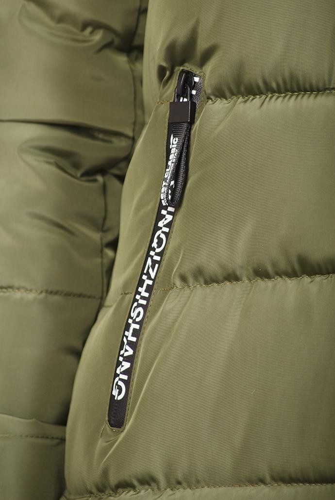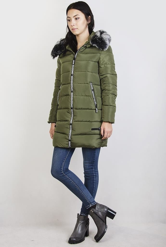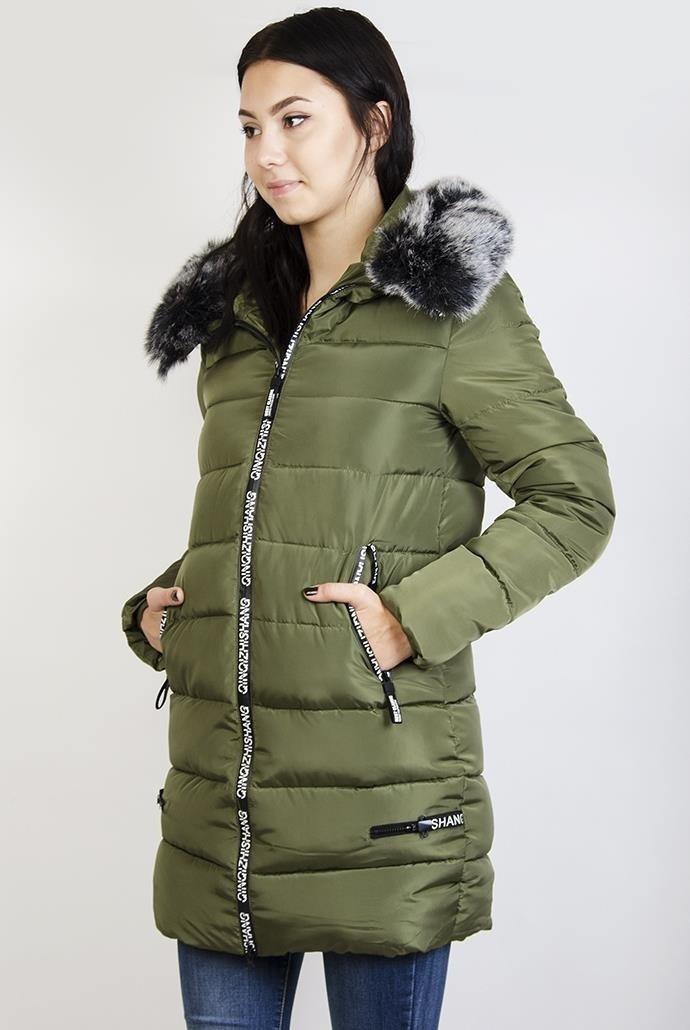 Zielona ocieplana, przedłużana kurtka z futerkiem przy kapturze, które można odpiąć.