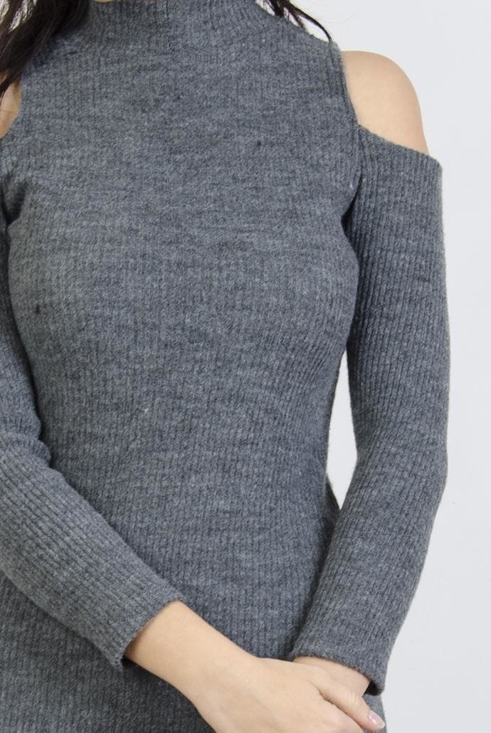 Szara, prążkowana sukienka midi z wycięciami na ramionach
