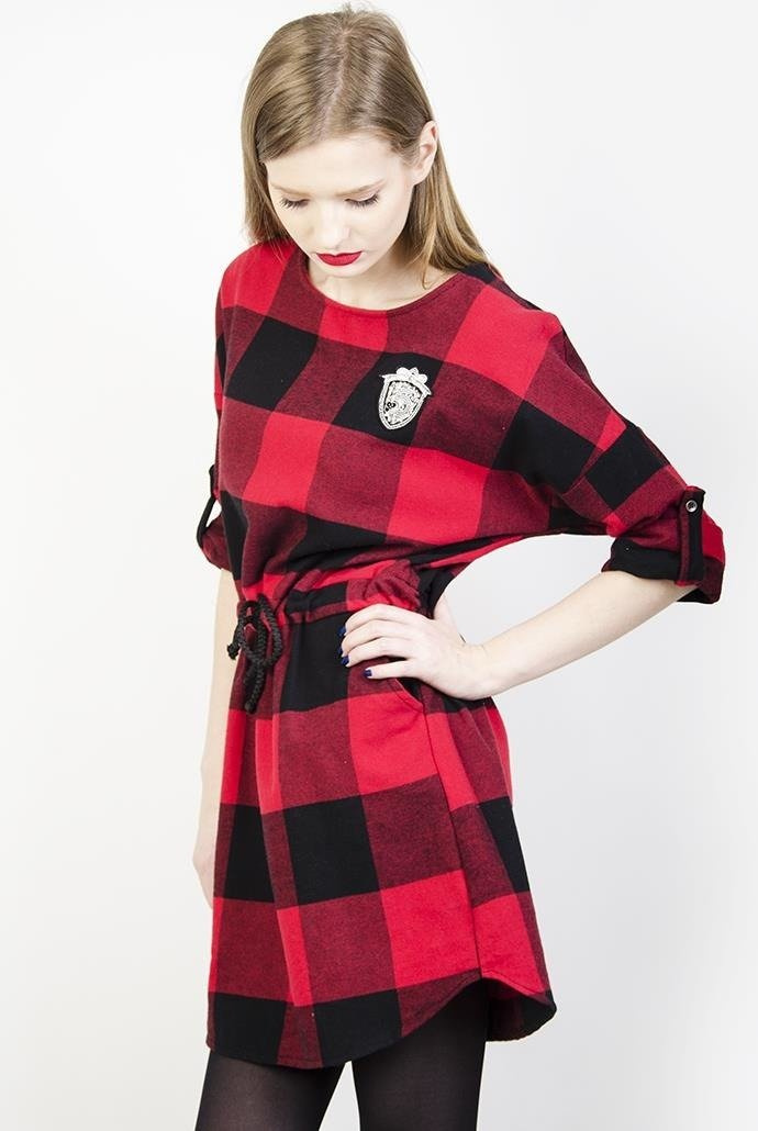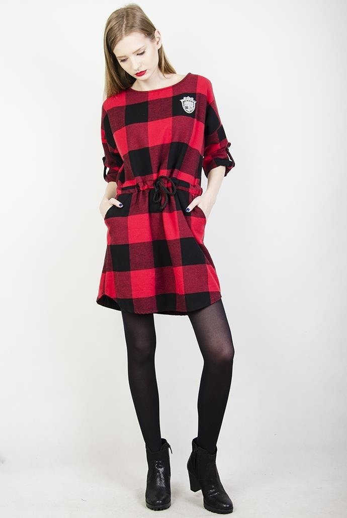 Sukienka w czerwono-czarną kratę, z naszywką.