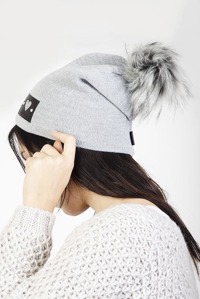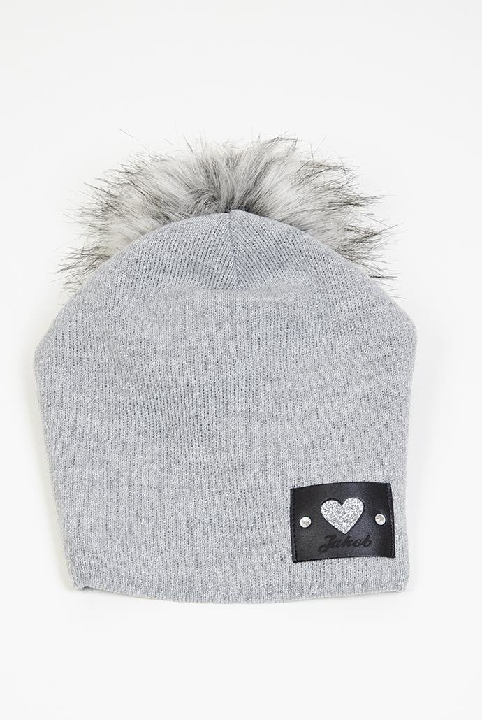 Szara czapka z wszywką z serduszkiem i pomponem.
