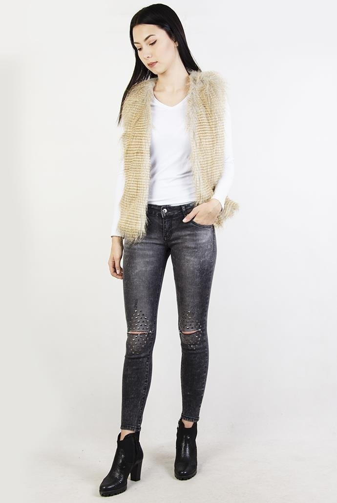 Szare spodnie jeansowe, przylegające, z ćwiekami i wycięciami przy kolanie.