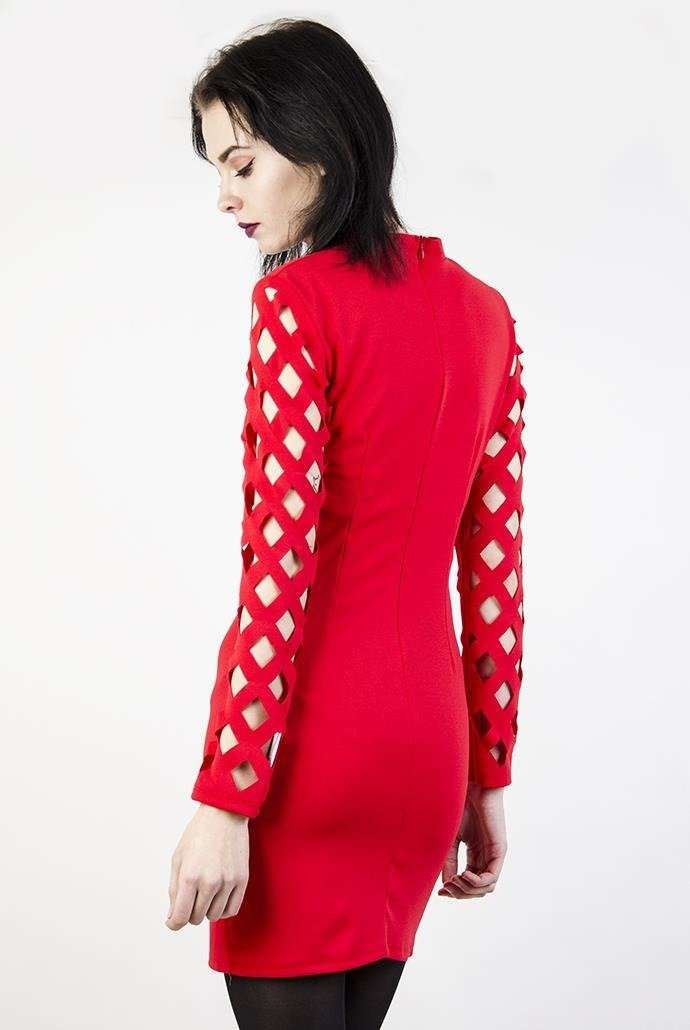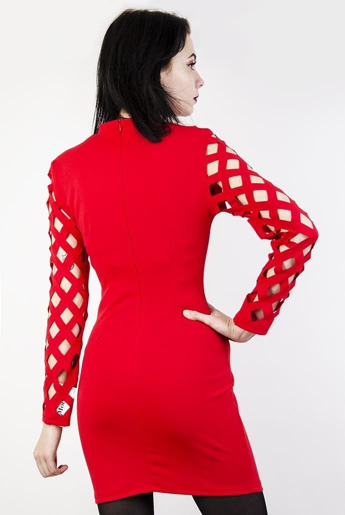 Czerwona sukienka z wycięciami, z tyłu posiada zapięcie na zamek.