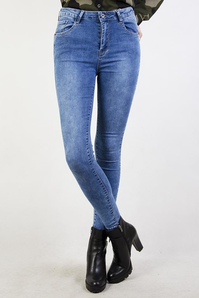 Jasne spodnie jeansowe przylegające, posiadają średni stan.
