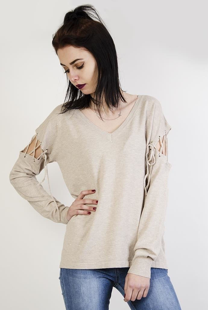 Beżowy sweterek z dekoltem w serek oraz wiązaniami przy ramionach. Wykonany z przyjemnego w dotyku materiału. Posiada jasnoniebieskie drobinki.