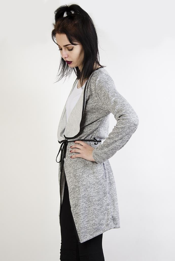 Jasnoszara narzuta wiązana w pasie. Posiada kieszenie.