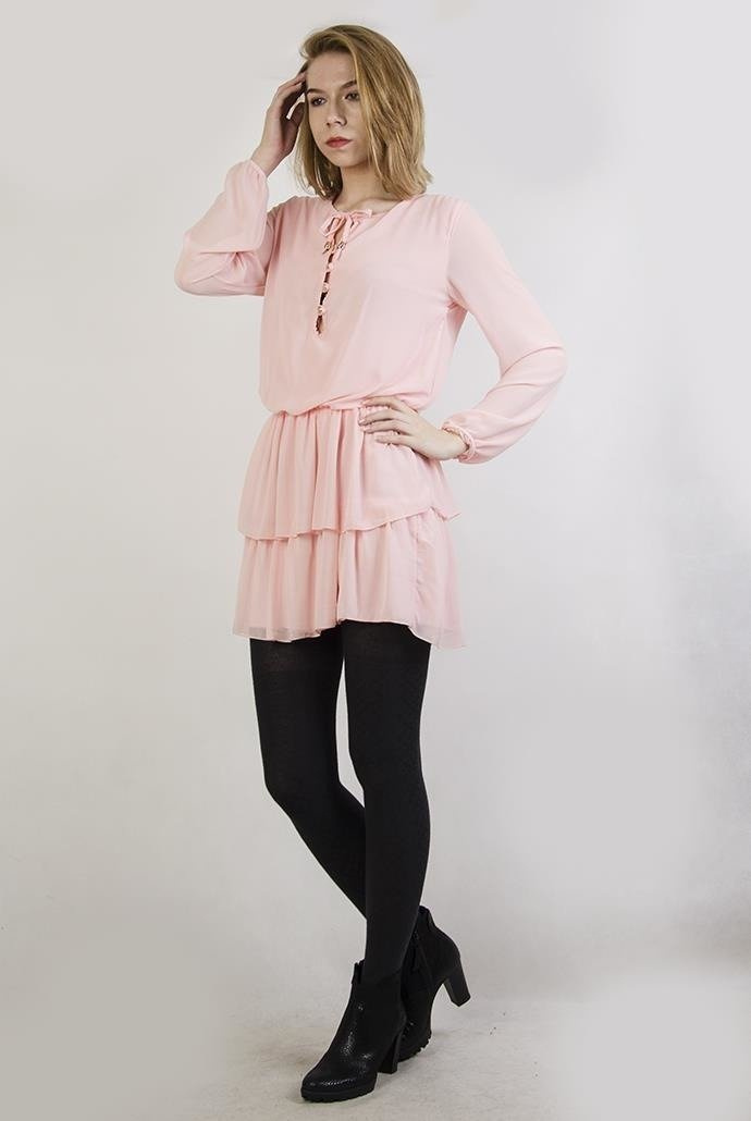 Pudroworóżowa szyfonowa sukienka z wiązaniem i falbanami, posiada gumkę w talii oraz przy rękawach.