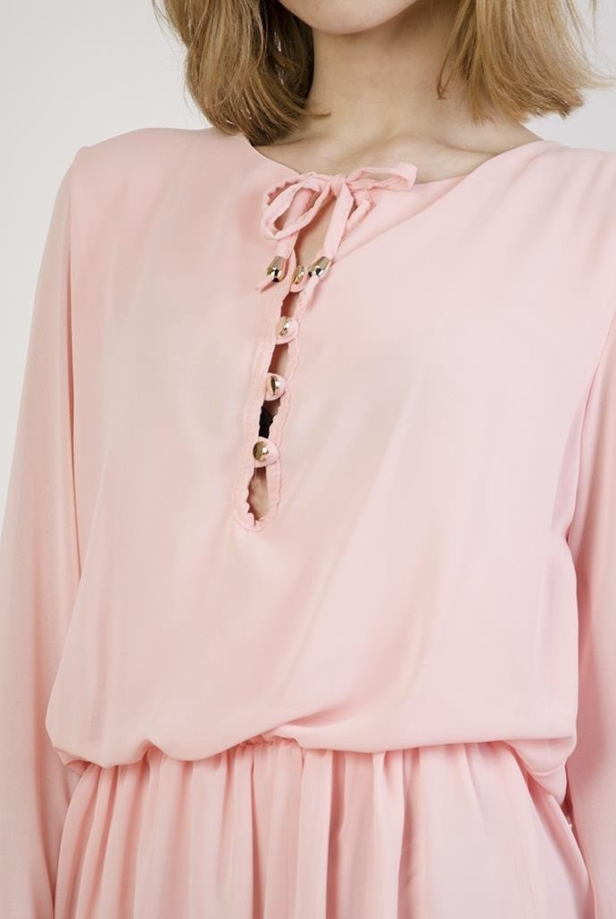 Pudroworóżowa szyfonowa sukienka z wiązaniem i falbanami