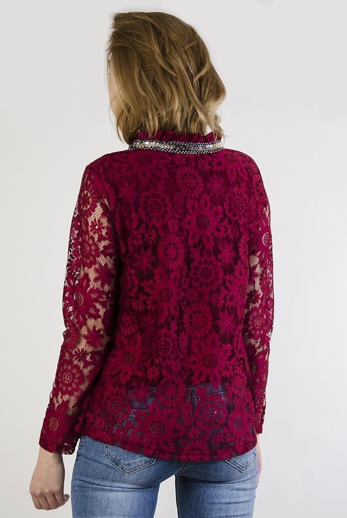 Bordowa bluzka koronkowa, z efektownym kołnierzykiem.