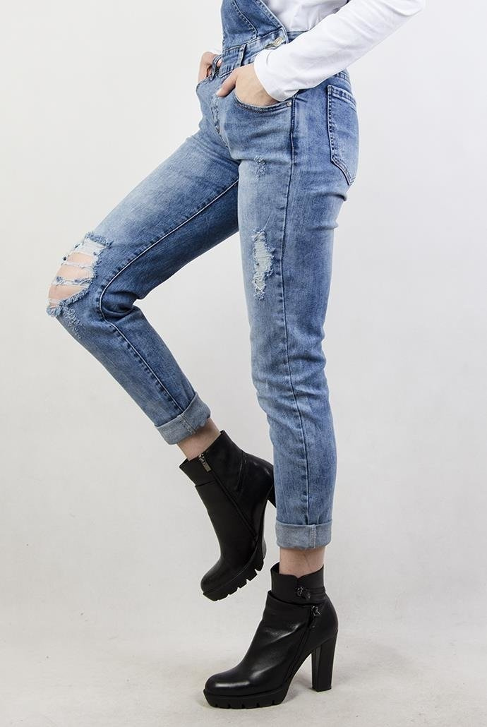 Spodnie jeansowe ogrodniczki, z przetarciami