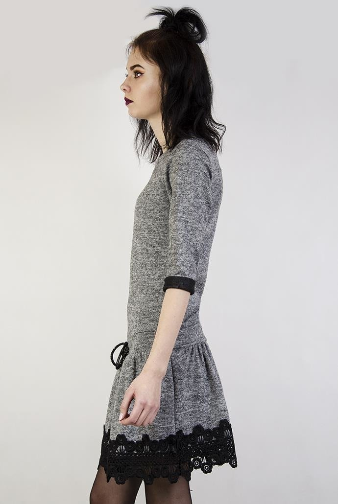 Szara sukienka ze sznurkiem w pasie i ażurowym zdobieniem na dole.