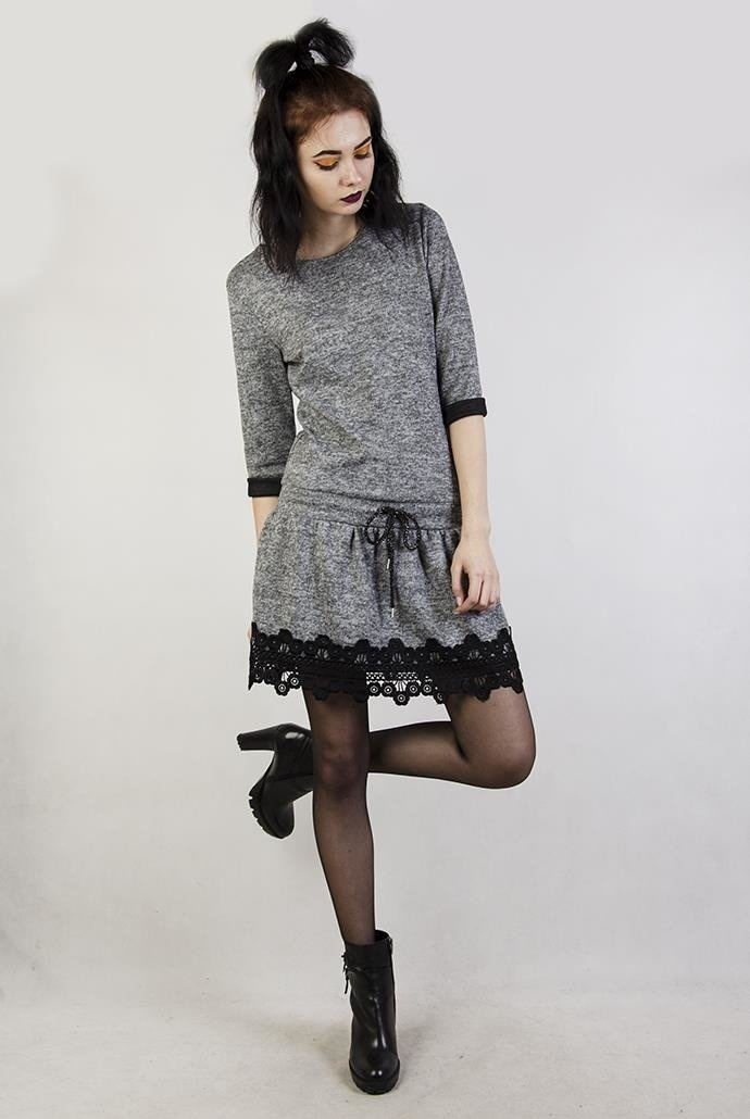 Szara sukienka ze sznurkiem w pasie i ażurowym zdobieniem na dole