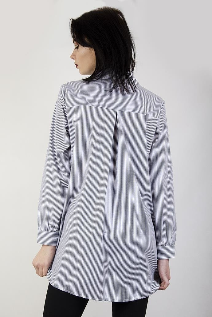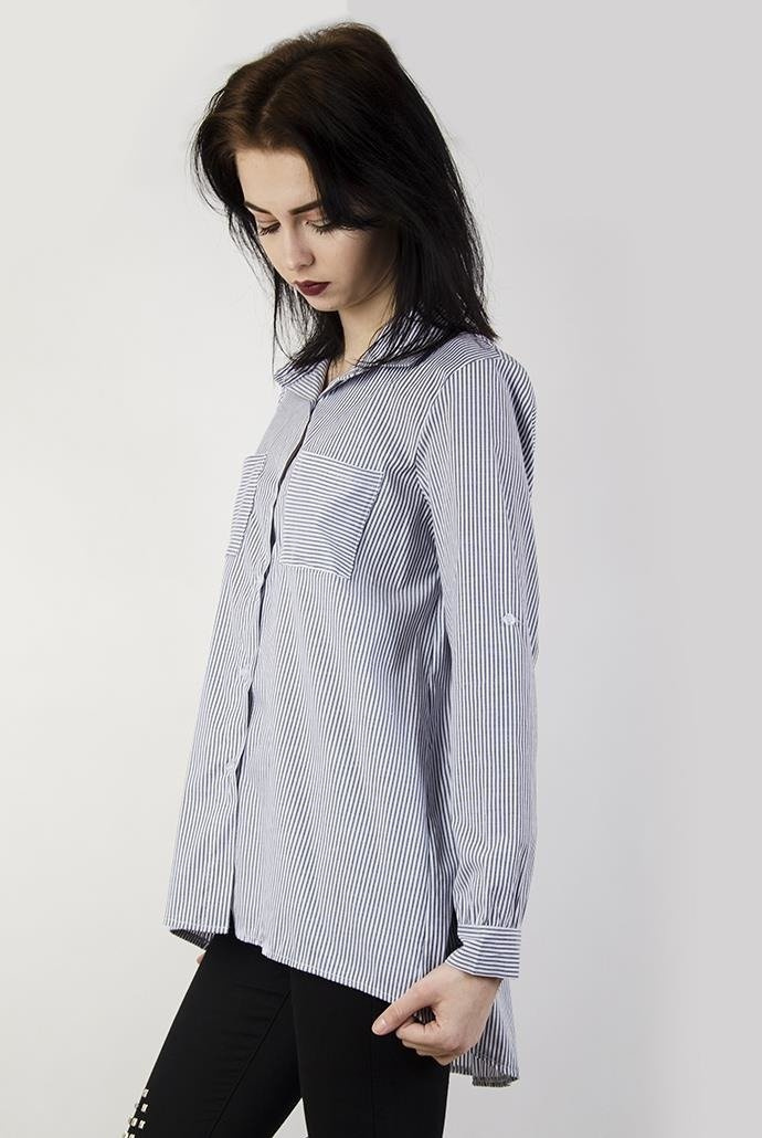 Szara koszula w paski, zapinana na guziki, z kieszonkami.
