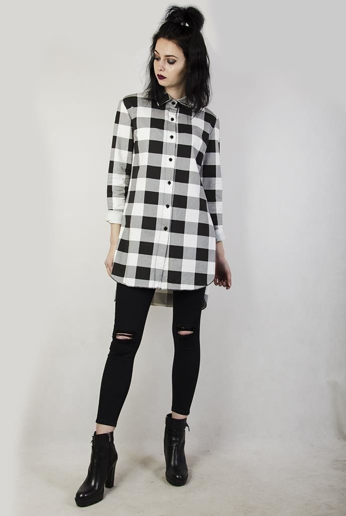 Asymetryczna koszula w czarno-białą kratę. Zapinana na guziki.
