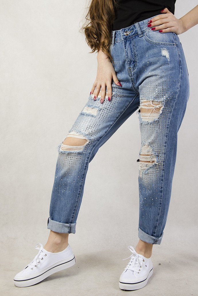 Spodnie jeansowe typu boyfriend z cyrkoniami i dziurami