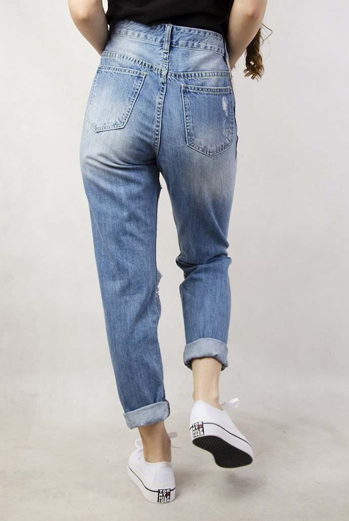 Spodnie jeansowe typu boyfriend z cyrkoniami i dziurami. Posiadają wysoki stan.